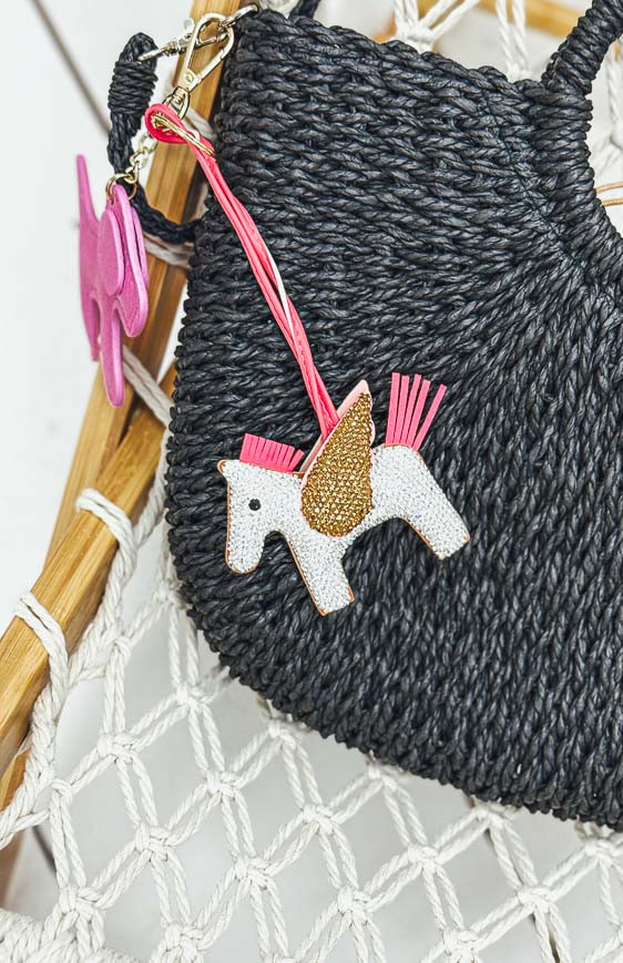 The DIAS bag jewel lights up your outfits with its little leather unicorn adorned with rhinestones, just in the fairytale bohemian spirit we love. Its shiny finish catches the light beautifully and adds a dose of magic to your favourite bag. Easy to hang thanks to its supple leather strap, it goes equally well with a wicker basket or a more formal clutch. A precious, quirky detail that will make you smile at every glance.