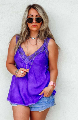 Revive your bohemian look with the LOUSSINE sleeveless purple top, a must-have in your wardrobe. Its straight cut and straps make it a versatile piece, perfect for all occasions. Designed in a fluid, lightweight fabric, it's extremely comfortable to wear, ideal for sunny days. With its neckline and straps adorned with delicate lace and satin texture, this top adds a feminine, elegant touch to your outfit. What's more, its elasticated back ensures a perfect fit, adapting to all body shapes.