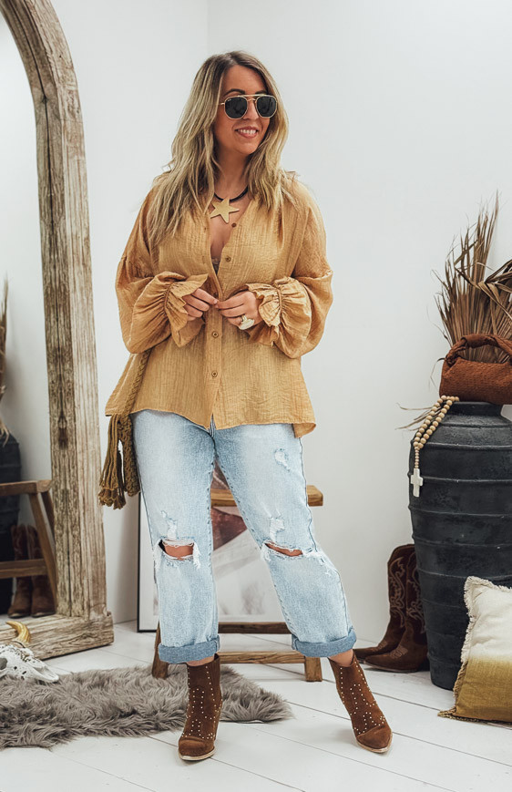 Craquez pour la chemise EVANIE de la marque La Petite Boho, une pièce tout en légèreté qui respire le style bohème chic. Son col tunisien et sa coupe ample offrent une allure décontractée, tandis que son tissu à l’effet gaze de coton procure une sensation de douceur incomparable. Les manches longues à volants et les poignets élastiqués apportent une touche féminine délicate et élégante. Ses boutons ton sur ton viennent parfaire cette silhouette bohème pleine de charme et de naturel.